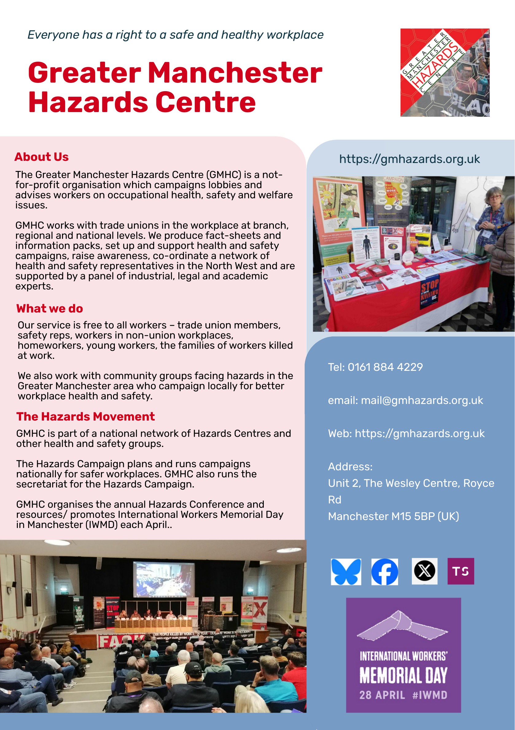 Greater Manchester Hazards Centre is part of a national network of Hazards Centres and other health and safety groups. The Hazards Campaign plans and runs campaigns nationally for safer workplaces. GMHC runs the secretariat for the Hazards Campaign, organises the annual Hazards Conference as well as resourcing and promoting International Workers Memorial Day (IWMD) on 28 April every year. Download /print our ‘About Us’ leaflet.