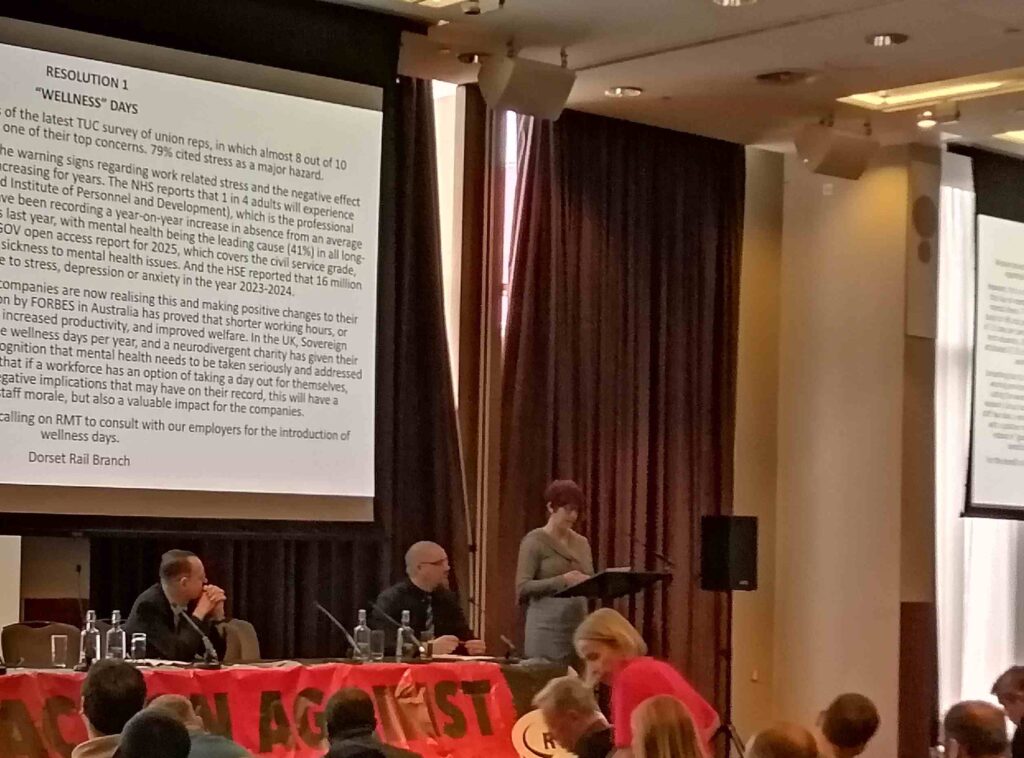 A representative from the RMT Dorset branch presented Resolution 1 which called for the RMT to back calls for ‘wellness’ days to help mitigate the rise in sickness due to stress.
